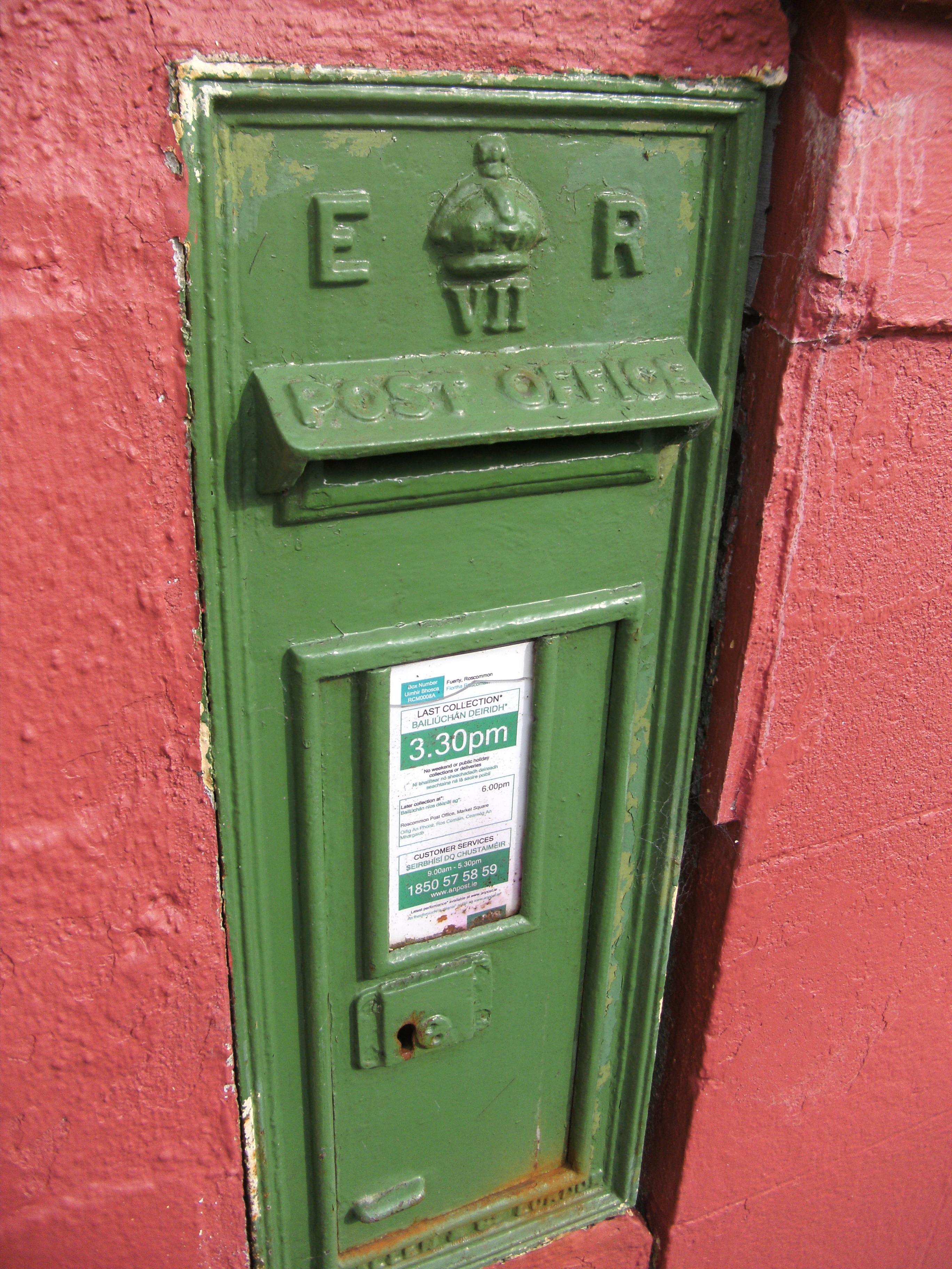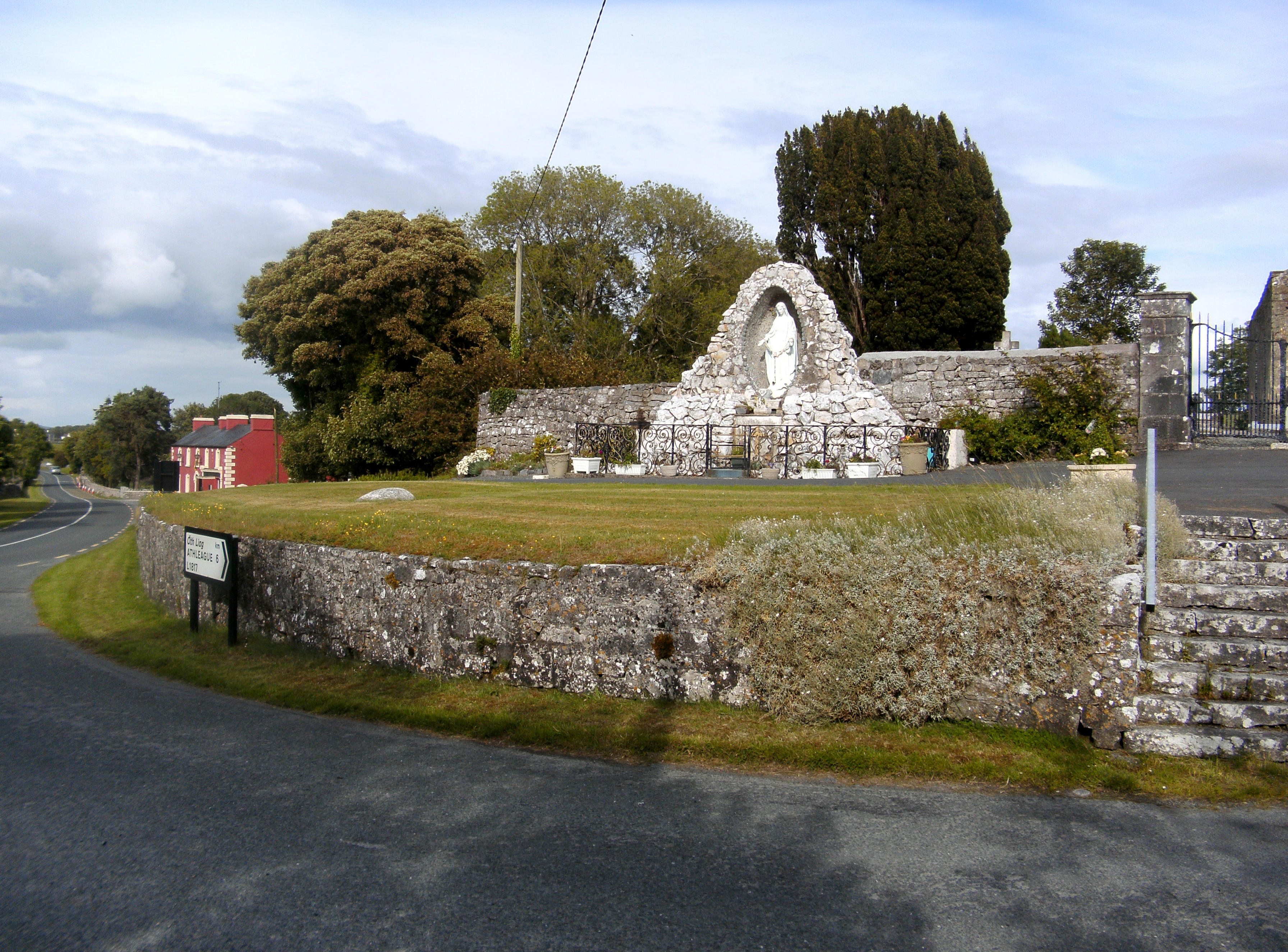 The area around the church is immaculately kept by the local community; and certain architectural relics of yesteryear are still preserved. The site of an old fair green just across the road is particularly colourful in the summer months. The remains of an old forge complete with millstones and wheels can also be seen. A few meters down the road, adjacent the local pub (in what once was the local RIC barracks) is an old-fashioned post box built into the wall. Despite the green paint, its original Edwardian inscription can still be made out; a timely reminder that archaeological stratigraphy can sometimes only be a layer of paint deep.