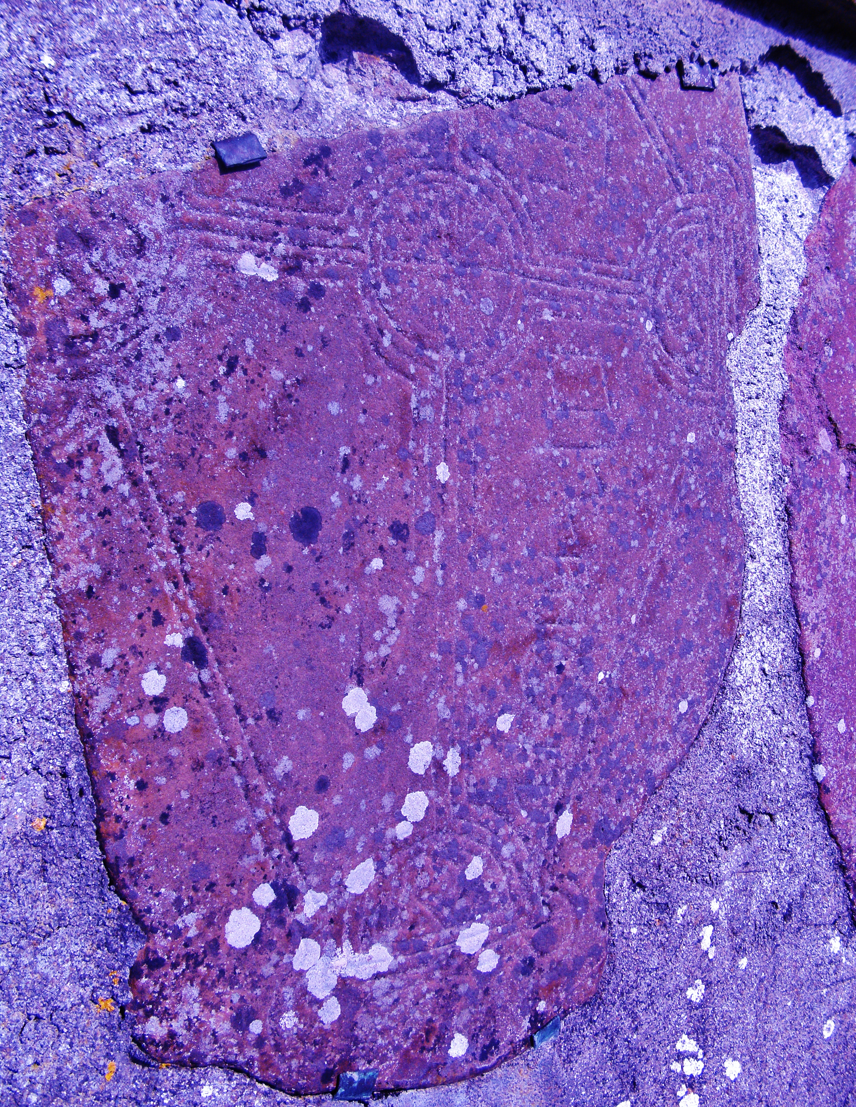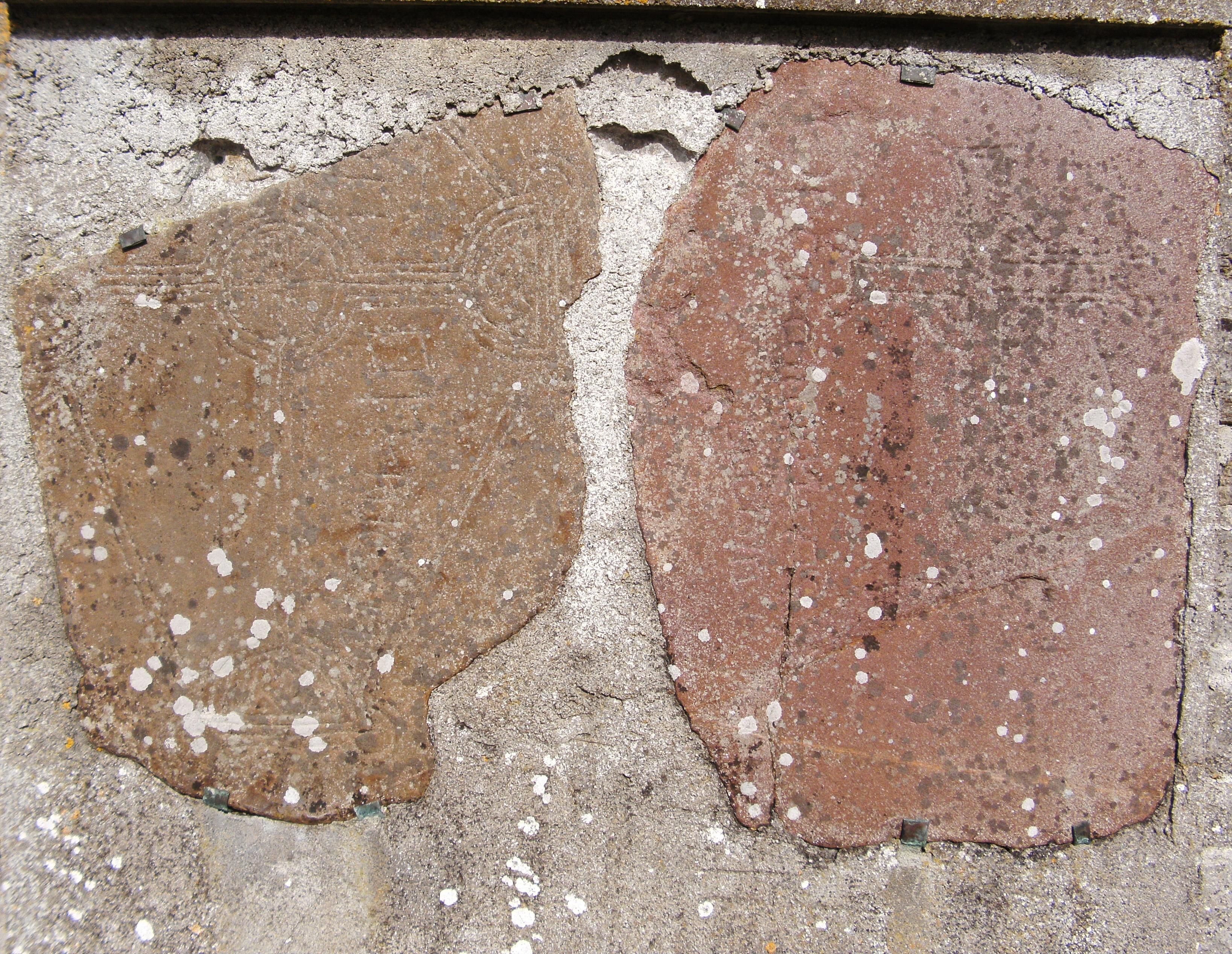 One of the slabs (SMR: RO039-063003) is incised with two-lined ringed cross, a fish motif and an inscription that reads ‘or ar anmain aidacain‘ (‘A prayer for the name/soul of aidacain’). The other slab (SMR: RO039-063004) contains an incised five-line cross with expanded terminals and an inscription the reads ‘or ar mor‘ (‘a prayer for the large/the many’). Another cross-slab (SMR: RO039-063005) which was decorated with a swastika cross symbol (a common early Christian motif) is known to have come from the site; while a further slab marking a grave (SMR: RO039-063009) in the churchyard contains a Maltese cross.