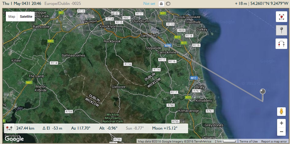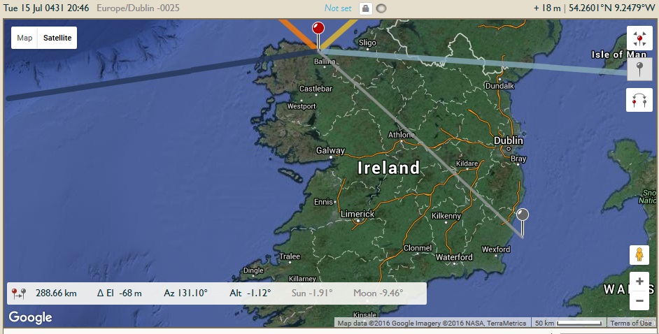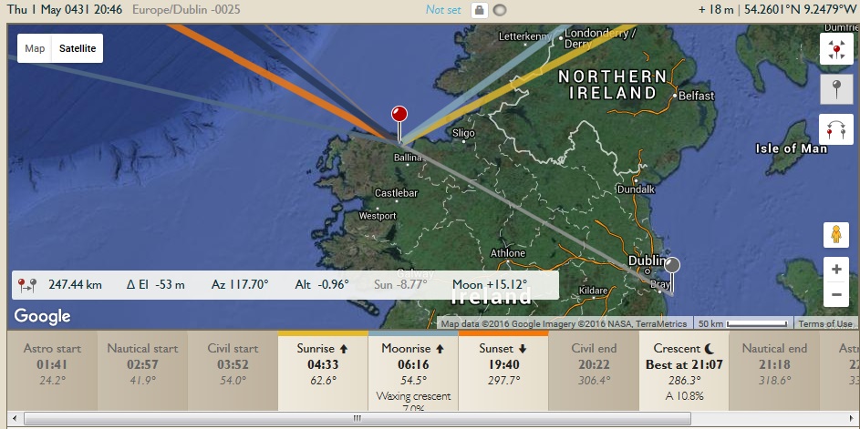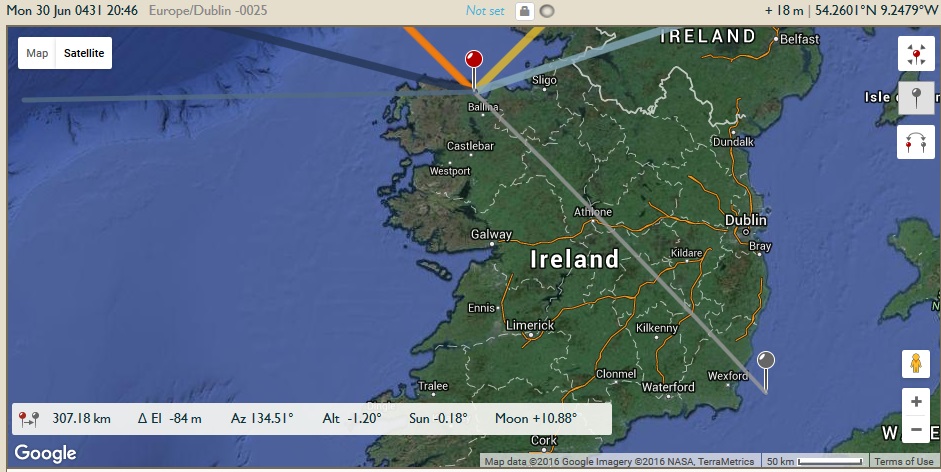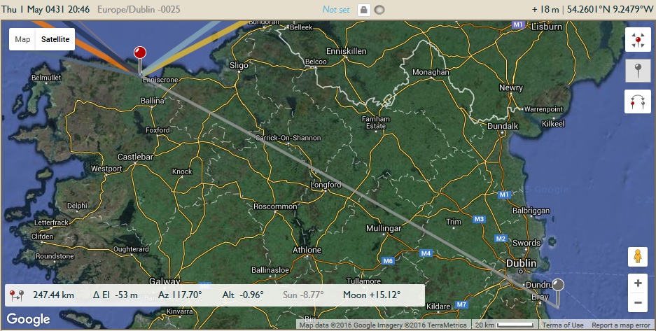 Above is a visualization of sun and moon rise/set, projected over google maps, for May 1st, 431 AD. I picked one of the traditional irish annal dates for Patrick, only as an example. Truth be told, the angles and azimuths have barely changed in the succeeding centuries and it doesn’t make much difference at all – but in the interests of accuracy, I have dated it to early fifth century. (Personally, I reckon it was late fourth century AD).
